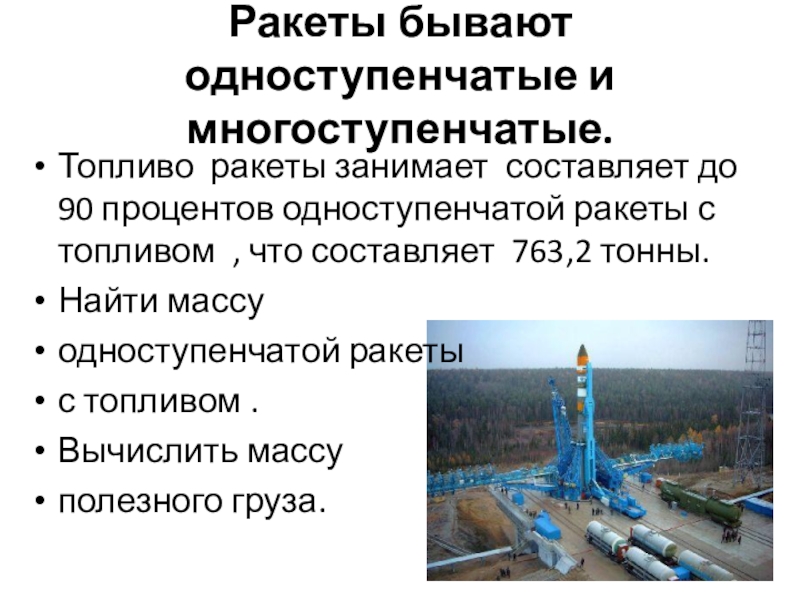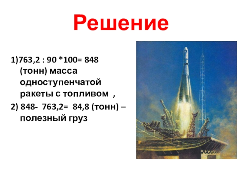 1)763,2 : 90 *100= 848 (тонн) масса одноступенчатой ракеты с