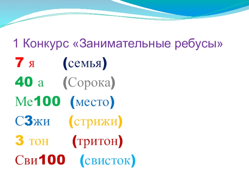 1 Конкурс «Занимательные ребусы»7 я (семья)40 а (Сорока) Ме100 (место) С3жи (стрижи)3 тон (тритон)Сви100 (свисток)