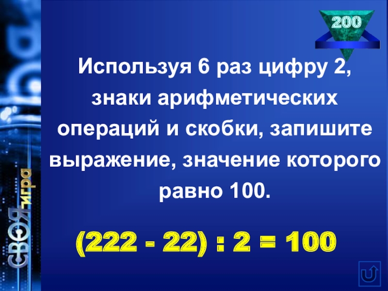 (222 - 22) : 2 = 100