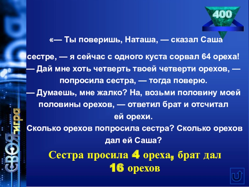 Сестра просила 4 ореха, брат дал 16 орехов