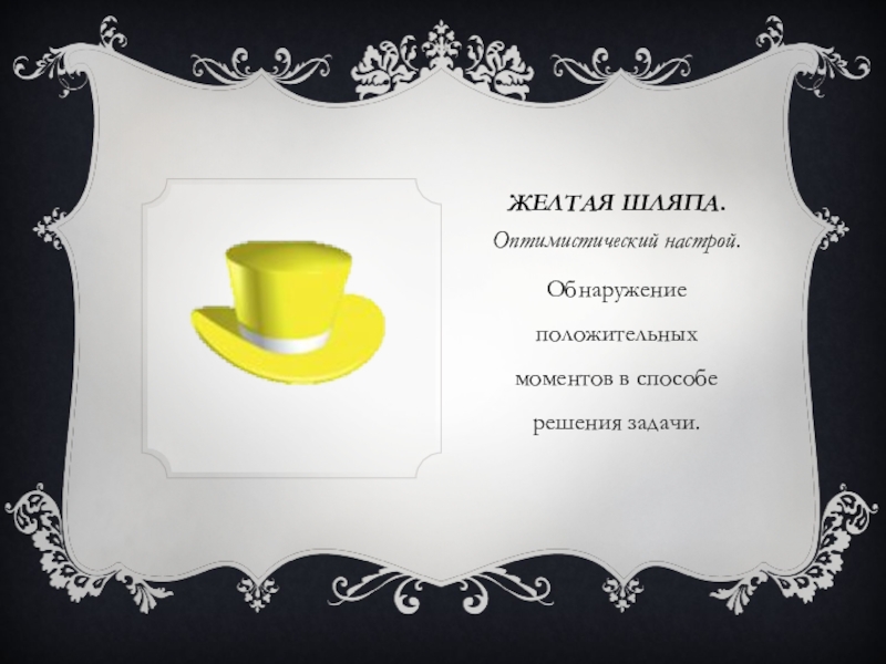 Желтая Шляпа. Оптимистический настрой.Обнаружение положительных моментов в способе решения задачи.