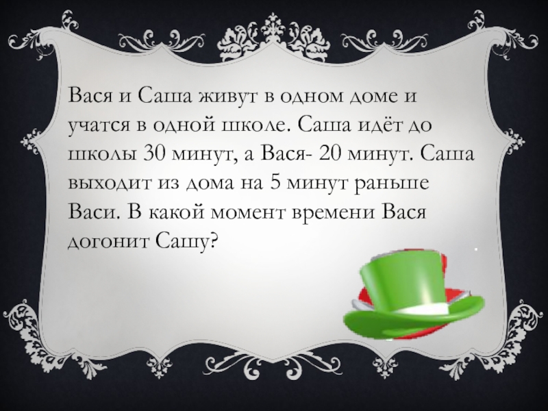школе. Саша идёт до школы 30 минут, а Вася- 20 минут. Саша выходит из дома на 5 минут раньше Васи. В какой момент времени Вася догонит Сашу?