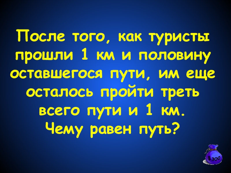 Слайд 23После того, как туристы прошли 1 км и половину оставшегося пути,