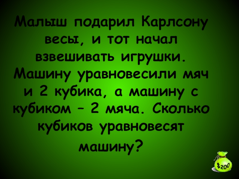 Слайд 15Малыш подарил Карлсону весы, и тот начал взвешивать игрушки. Машину уравновесили