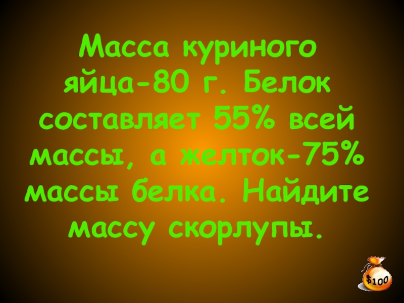 Слайд 6Масса куриного яйца-80 г. Белок составляет 55% всей массы, а желток-75%