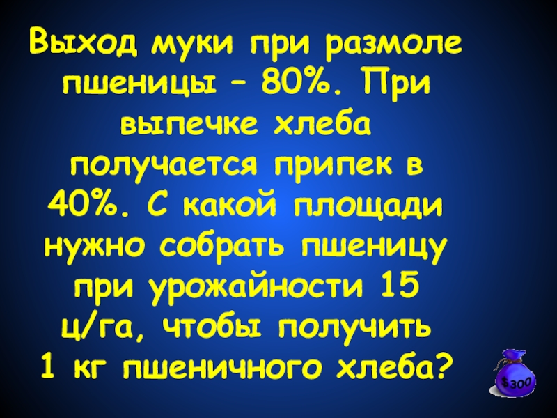 Выход муки при размоле пшеницы – 80%. При выпечке хлеба получается припек в 40%. С какой площади