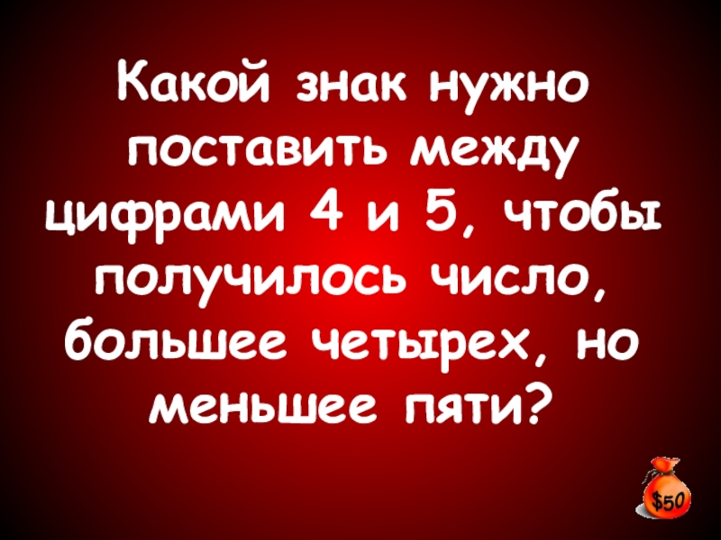 Слайд 3Какой знак нужно поставить между цифрами 4 и 5, чтобы получилось