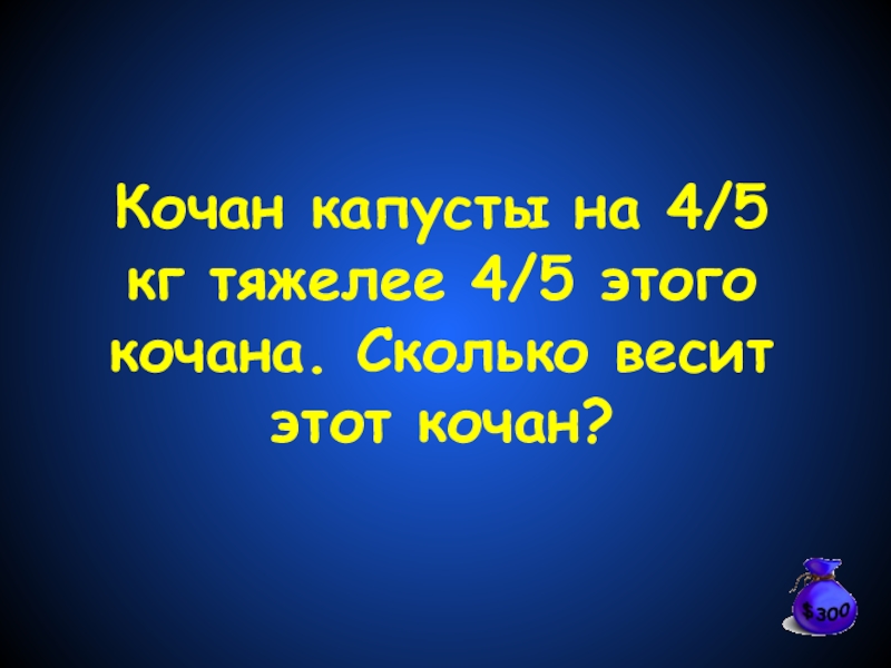 Слайд 25Кочан капусты на 4/5 кг тяжелее 4/5 этого кочана. Сколько весит