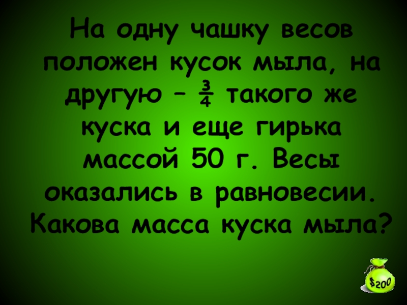 На одну чашку весов положен кусок мыла, на другую – ¾ такого же куска и еще гирька