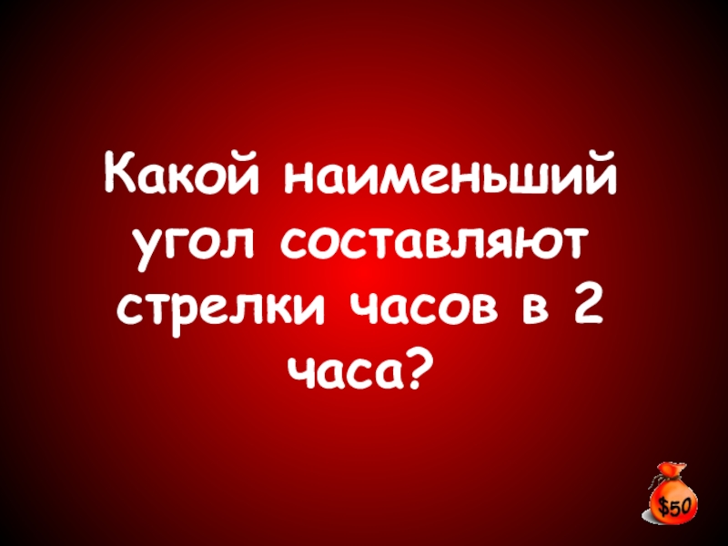 Слайд 4Какой наименьший угол составляют стрелки часов в 2 часа?