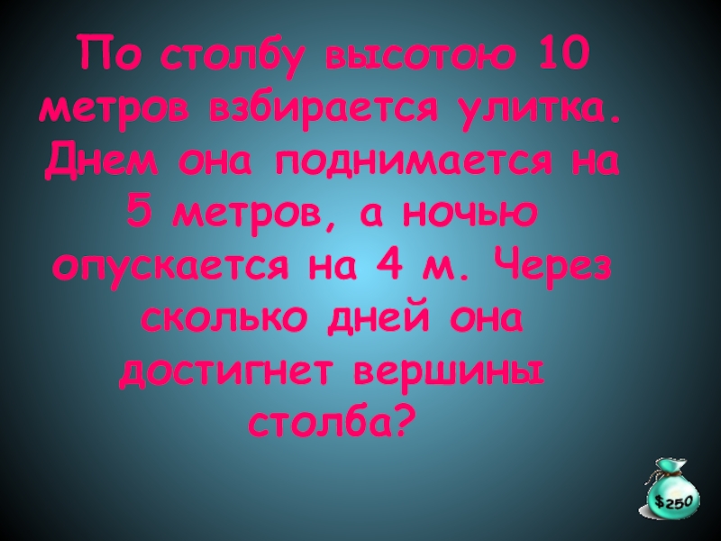 Слайд 21По столбу высотою 10 метров взбирается улитка. Днем она поднимается на