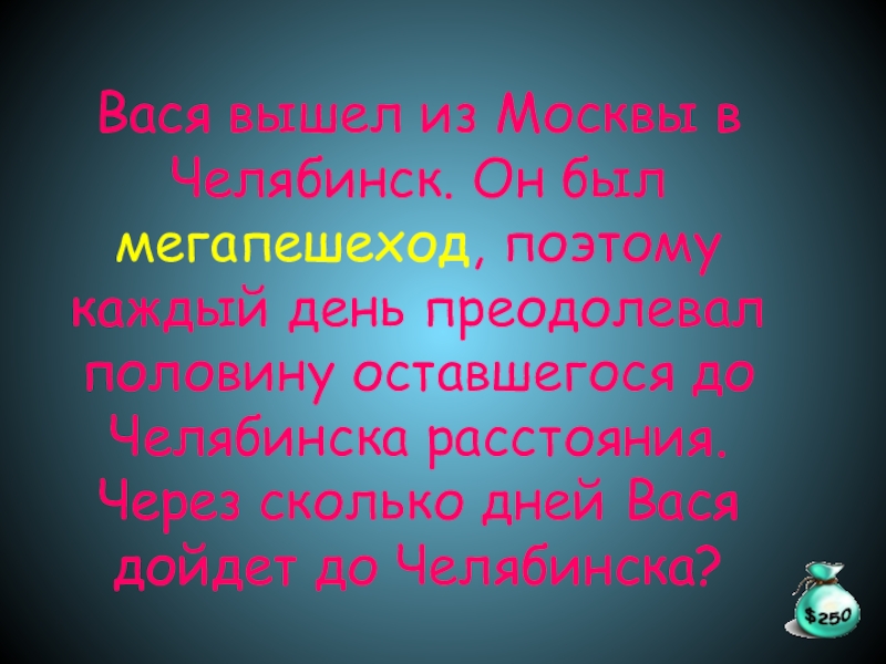 Слайд 19Вася вышел из Москвы в Челябинск. Он был мегапешеход, поэтому каждый