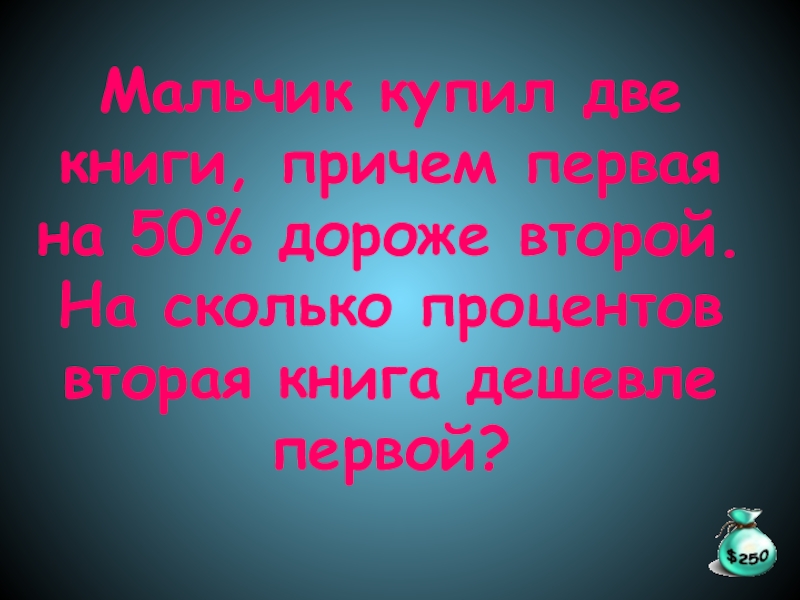 Слайд 18Мальчик купил две книги, причем первая на 50% дороже второй. На