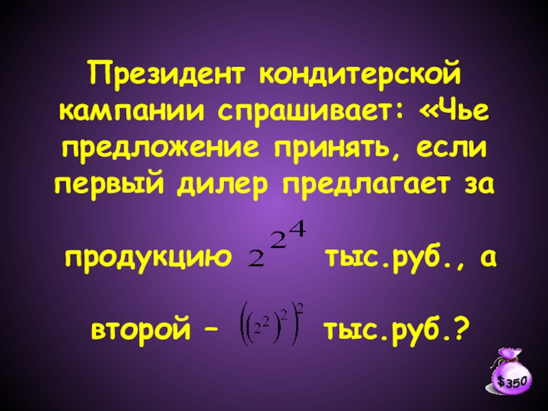 Слайд 26Президент кондитерской кампании спрашивает: «Чье предложение принять, если первый дилер предлагает
