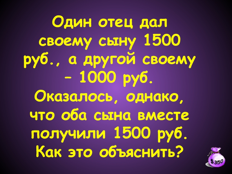 Слайд 28Один отец дал своему сыну 1500 руб., а другой своему –