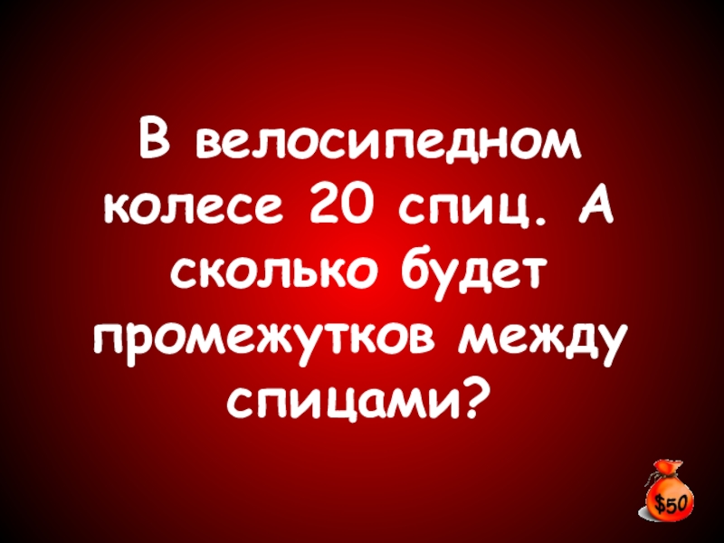 Слайд 5В велосипедном колесе 20 спиц. А сколько будет промежутков между спицами?