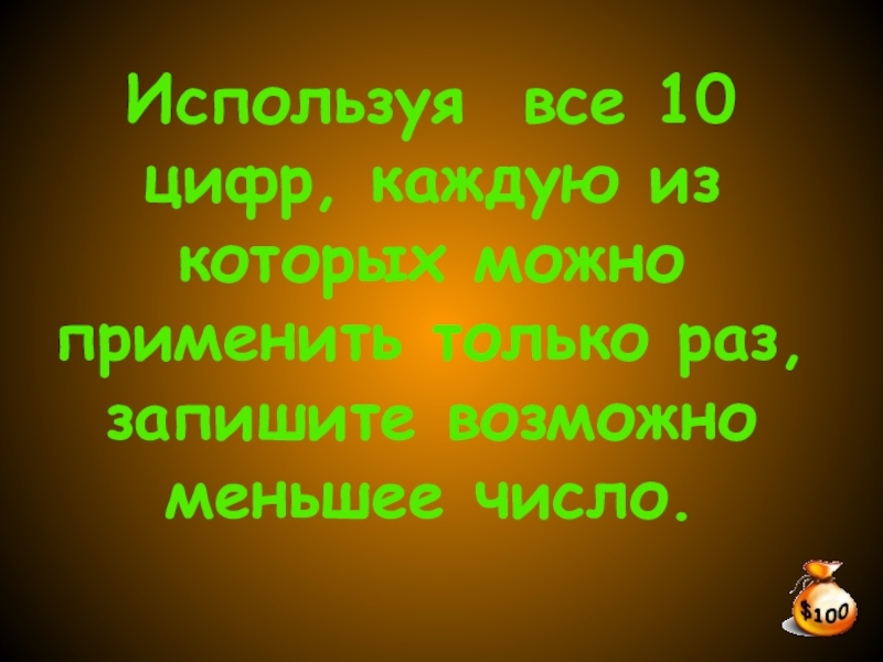 Слайд 7Используя все 10 цифр, каждую из которых можно применить только раз,