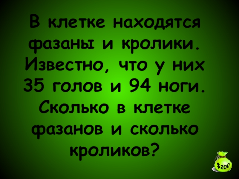 Слайд 14В клетке находятся фазаны и кролики. Известно, что у них 35