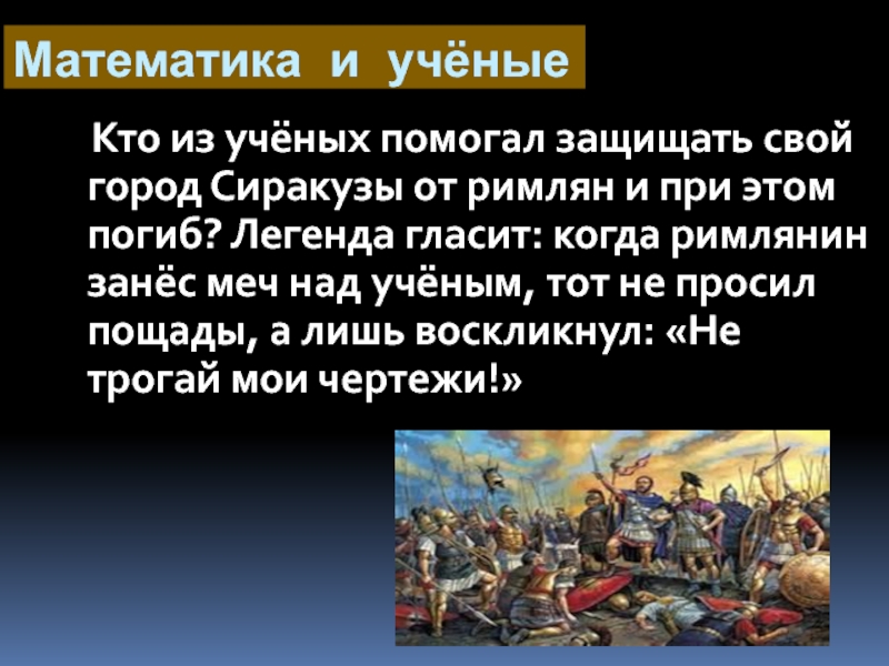 римлян и при этом погиб? Легенда гласит: когда римлянин занёс меч над учёным, тот не просил пощады, а лишь воскликнул: «Не трогай мои чертежи!»