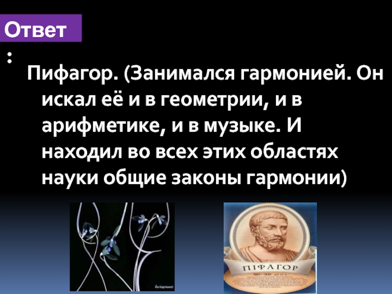 Пифагор. (Занимался гармонией. Он искал её и в геометрии, и в