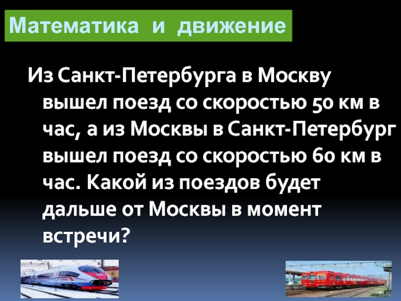 км в час, а из Москвы в Санкт-Петербург вышел поезд со скоростью 60 км в час. Какой из поездов будет дальше от Москвы в момент встречи?