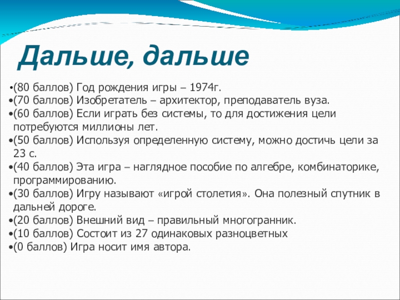 Дальше, дальше(80 баллов) Год рождения игры – 1974г.(70 баллов) Изобретатель – архитектор, преподаватель вуза.(60 баллов) Если играть
