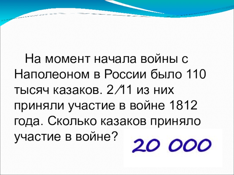 110 тысяч казаков. 2 ∕11 из них приняли участие в войне 1812 года. Сколько казаков приняло участие в войне?