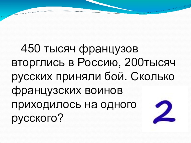 450 тысяч французов вторглись в Россию, 200тысяч русских приняли бой. Сколько французских воинов приходилось на