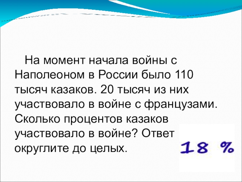 110 тысяч казаков. 20 тысяч из них участвовало в войне с французами. Сколько процентов казаков участвовало в войне? Ответ округлите до целых.