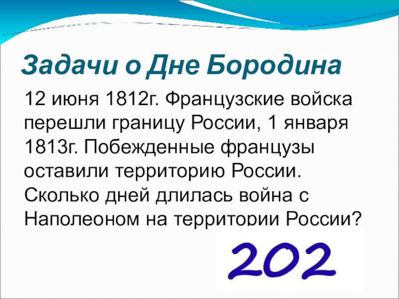 Задачи о Дне Бородина12 июня 1812г. Французские войска перешли границу России, 1 января 1813г. Побежденные французы оставили