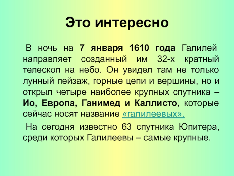 Это интересно	В ночь на 7 января 1610 года Галилей направляет созданный им 32-х кратный телескоп на небо.