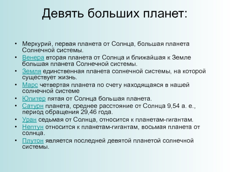 Девять больших планет: Меркурий, первая планета от Солнца, большая планета Солнечной системы.Венера вторая планета от Солнца и