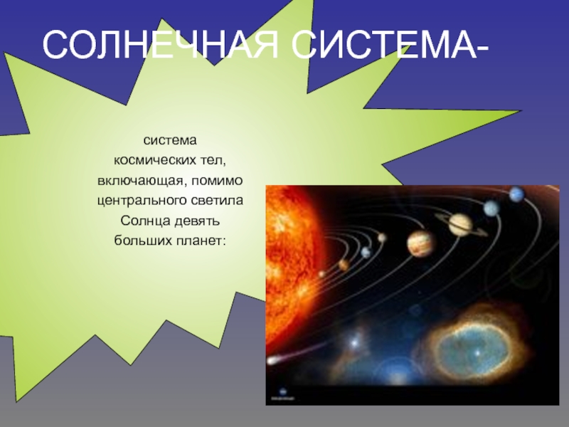 система космических тел, включающая, помимо центрального светила Солнца девять больших планет:СОЛНЕЧНАЯ СИСТЕМА-