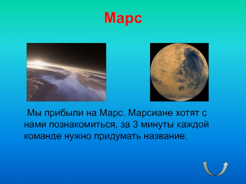 Марс	Мы прибыли на Марс. Марсиане хотят с нами познакомиться, за 3 минуты каждой команде нужно придумать название.