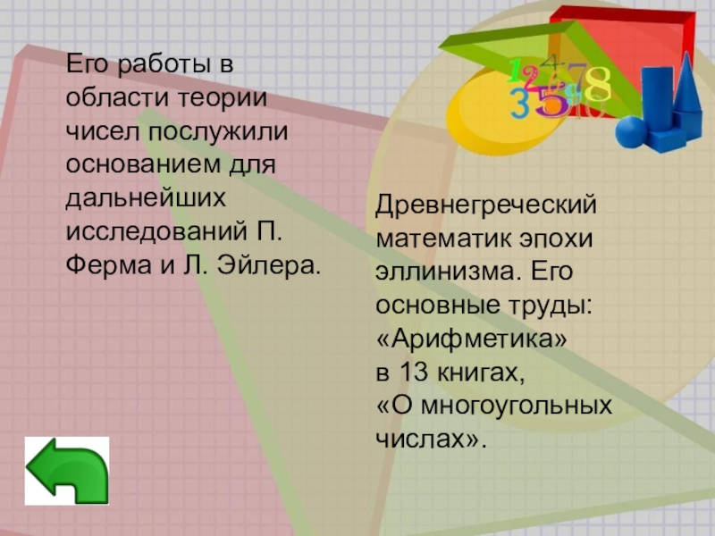 Древнегреческий математик эпохи эллинизма. Его основные труды: «Арифметика»