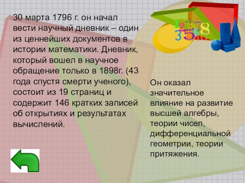 Он оказал значительное влияние на развитие высшей алгебры, теории чисел, дифференциальной геометрии, теории притяжения.