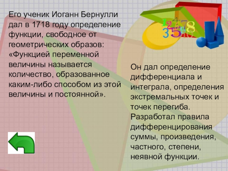 Он дал определение дифференциала и интеграла, определения экстремальных точек и точек перегиба. Разработал правила дифференцирования суммы, произведения, частного, степени, неявной функции.