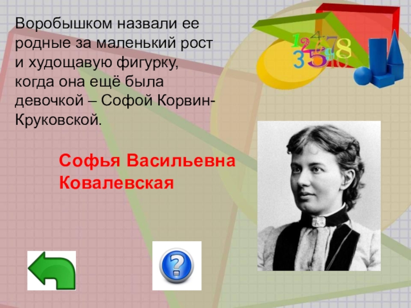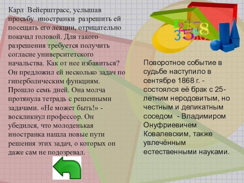 Карл Вейерштрасс, услышав просьбу иностранки разрешить ей посещать его лекции, отрицательно покачал головой. Для такого разрешения требуется получить согласие университетского начальства. Как от нее избавиться? Он предложил ей несколько задач по гиперболическим функциям. Прошло семь дней. Она молча протянула тетрадь с решенными задачами. «Не может быть!» - воскликнул профессор. Он убедился, что молоденькая иностранка нашла новые пути решения этих задач, о которых он даже сам не подозревал.