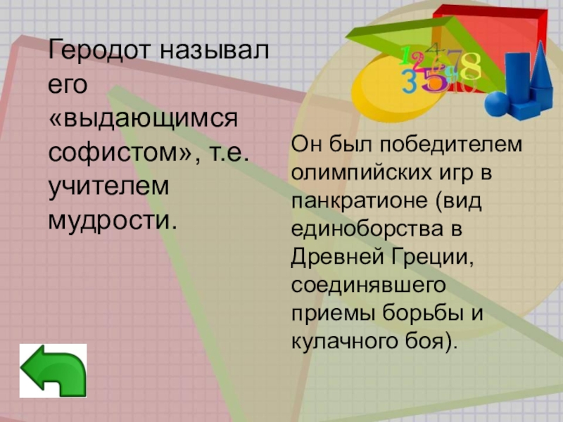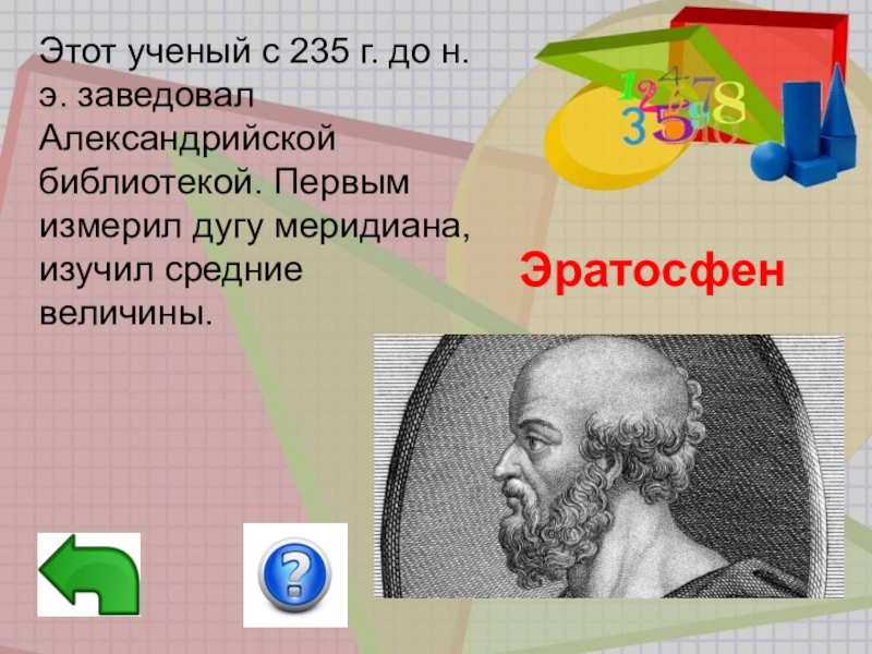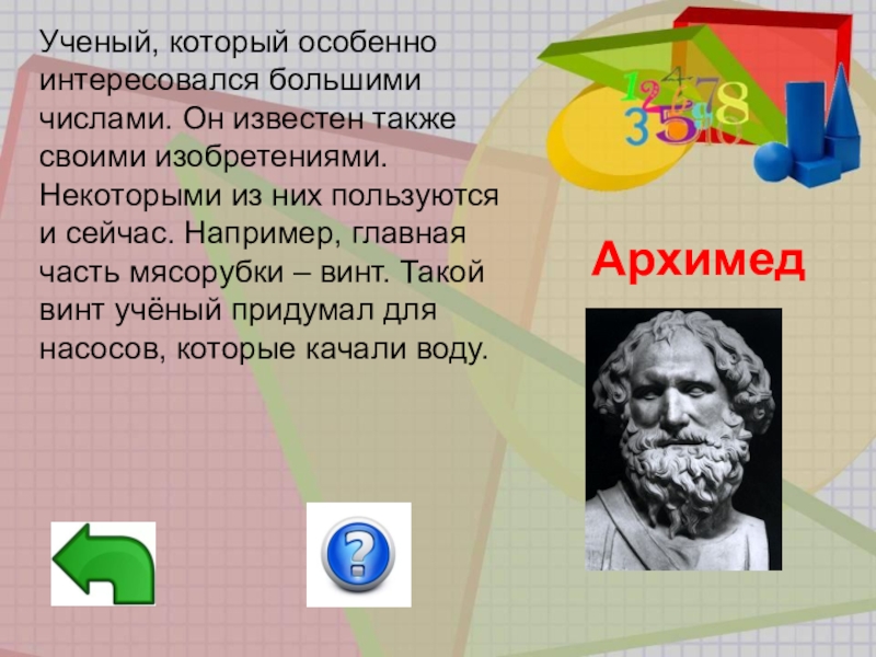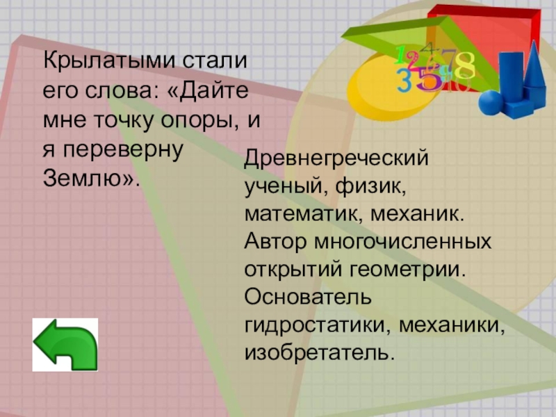 Древнегреческий ученый, физик, математик, механик. Автор многочисленных открытий геометрии. Основатель гидростатики, механики, изобретатель.