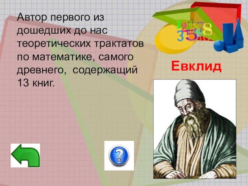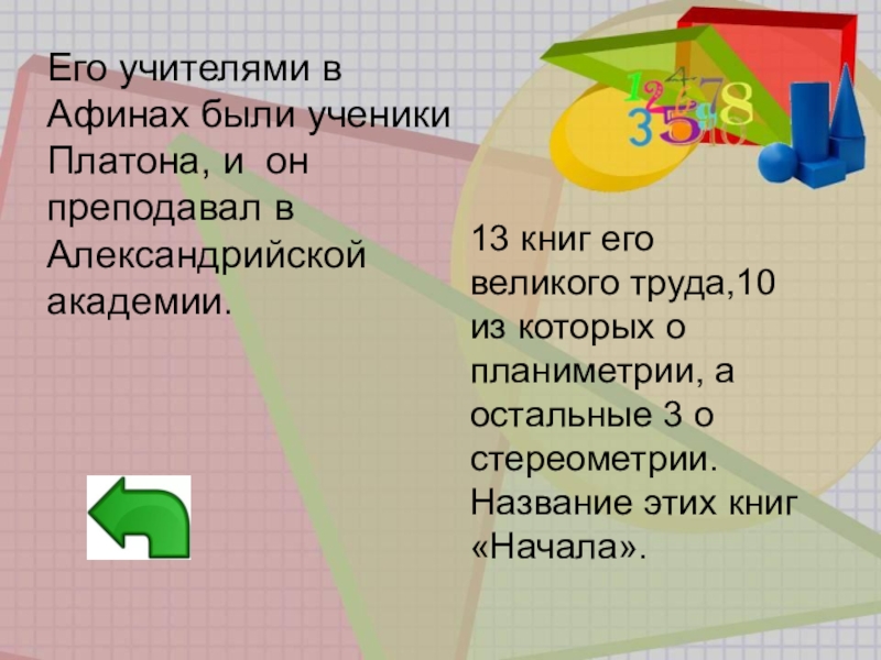 13 книг его великого труда,10 из которых о планиметрии, а остальные 3 о стереометрии. Название этих книг «Начала».