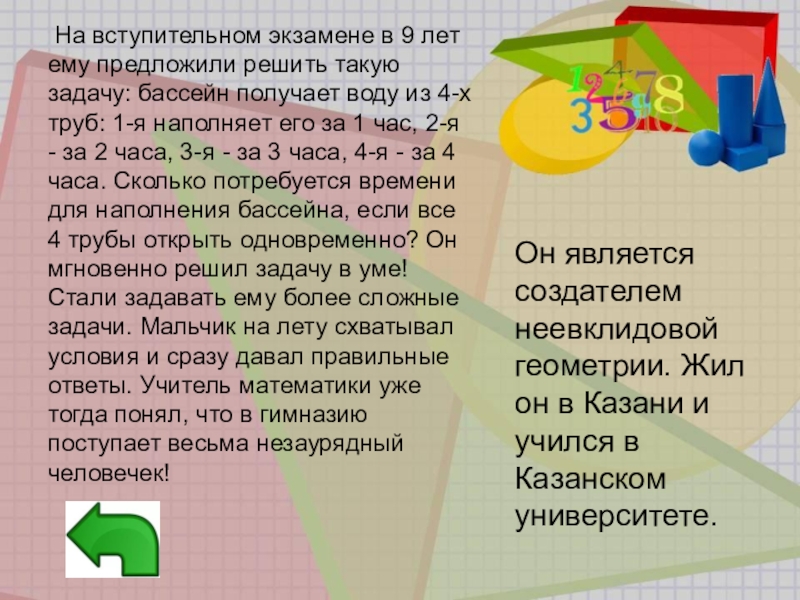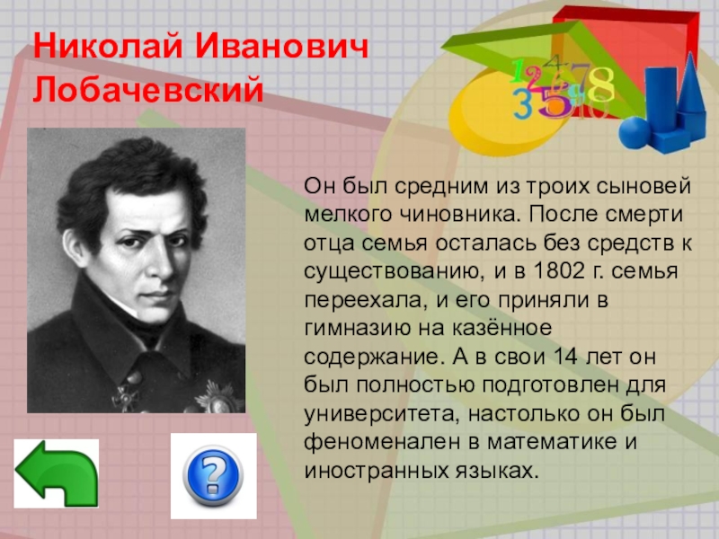 Он является создателем неевклидовой геометрии. Жил он в Казани и учился в Казанском университете.