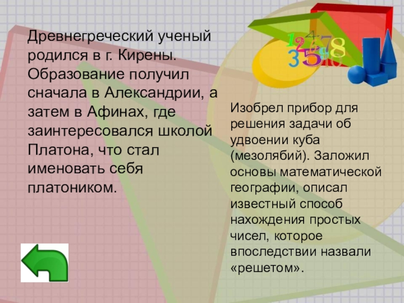 Изобрел прибор для решения задачи об удвоении куба (мезолябий). Заложил основы математической географии, описал известный способ нахождения простых чисел, которое впоследствии назвали «решетом».