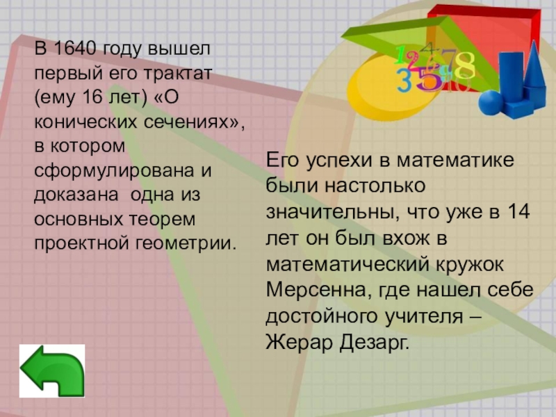В 1640 году вышел первый его трактат (ему 16 лет) «О конических сечениях», в котором сформулирована и доказана одна из основных теорем проектной геометрии.