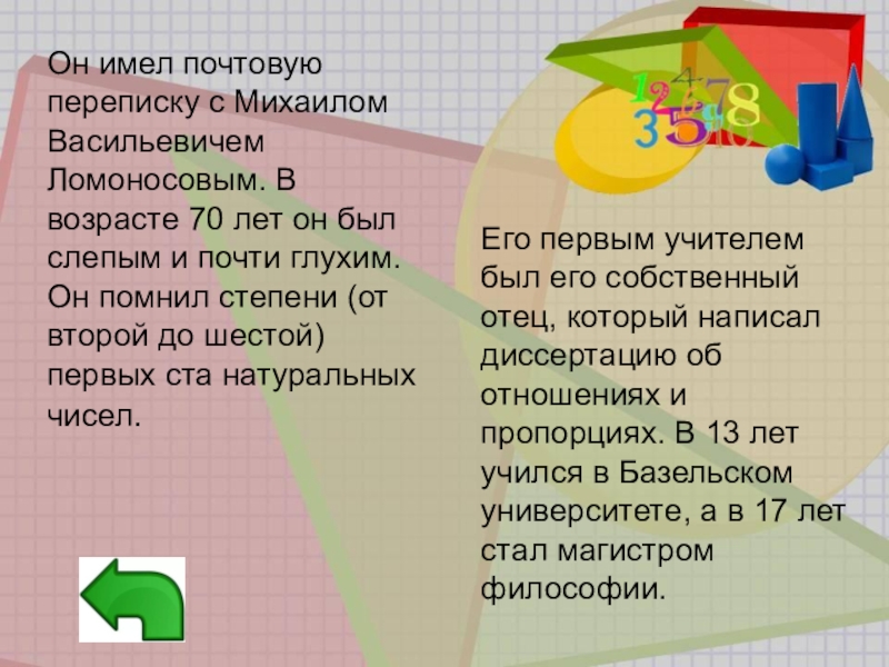 Он имел почтовую переписку с Михаилом Васильевичем Ломоносовым. В возрасте 70 лет он был слепым и почти глухим. Он помнил степени (от второй до шестой) первых ста натуральных чисел.