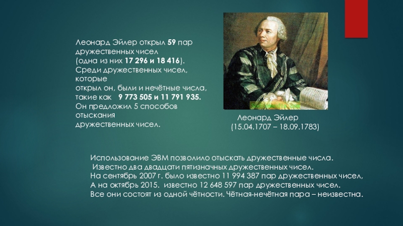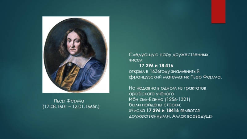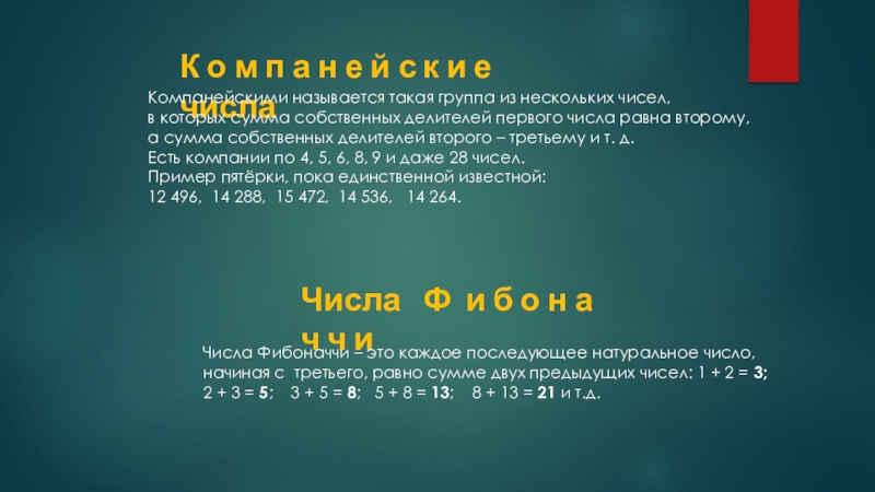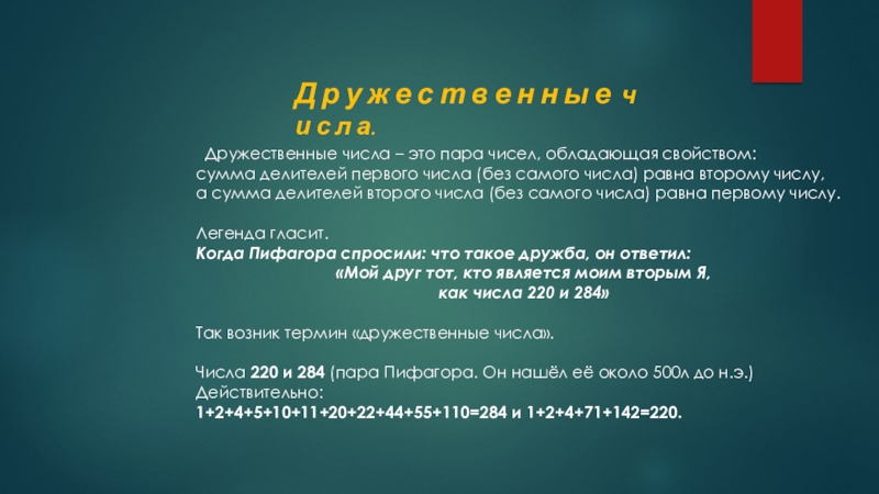 Числа 220 и 284 (пара Пифагора. Он нашёл её около 500л до н.э.)