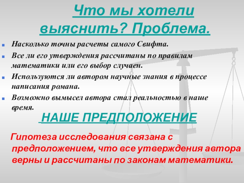 Гипотеза исследования связана с предположением, что все утверждения автора верны и рассчитаны по законам математики.