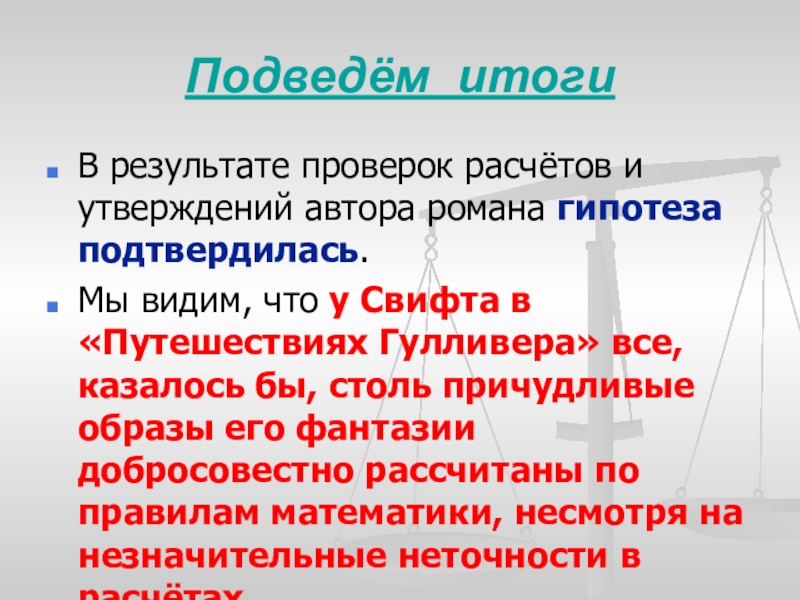 Мы видим, что у Свифта в «Путешествиях Гулливера» все, казалось бы, столь причудливые образы его фантазии добросовестно рассчитаны по правилам математики, несмотря на незначительные неточности в расчётах.