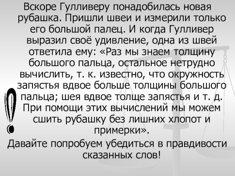 большой палец. И когда Гулливер выразил своё удивление, одна из швей ответила ему: «Раз мы знаем толщину большого пальца, остальное нетрудно вычислить, т. к. известно, что окружность запястья вдвое больше толщины большого пальца; шея вдвое толще запястья и т. д. При помощи этих вычислений мы можем сшить рубашку без лишних хлопот и примерки».