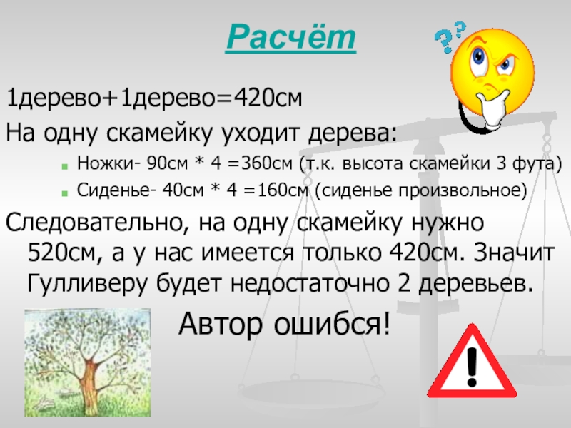 Следовательно, на одну скамейку нужно 520см, а у нас имеется только 420см. Значит Гулливеру будет недостаточно 2 деревьев.