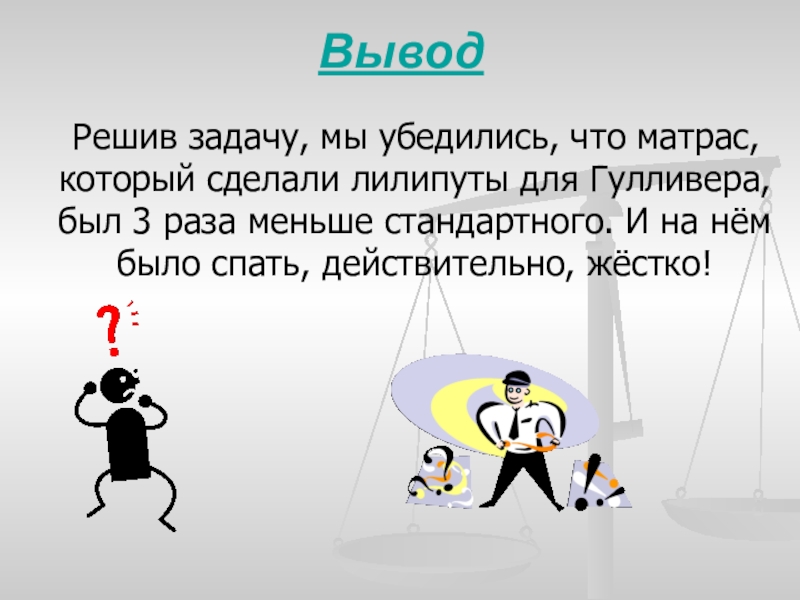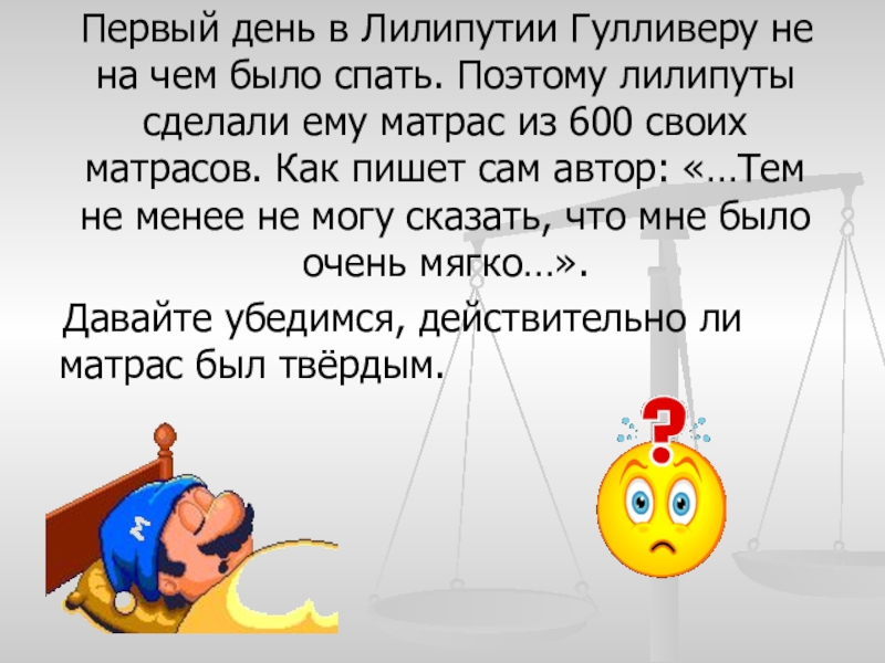 спать. Поэтому лилипуты сделали ему матрас из 600 своих матрасов. Как пишет сам автор: «…Тем не менее не могу сказать, что мне было очень мягко…».